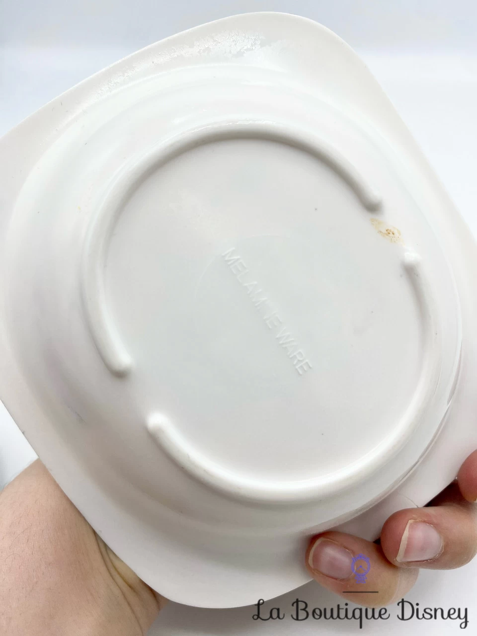 Assiette creuse blanche 100% melamine sur le thème de Lilo et Stitch. Au fond de l’assiette, Lilo fait un bisous au petit monstre bleu extraterrestre. Il y a un ovale jaune avec Ă l’intĂ©rieur les inscriptions « 626 STITCH Experiment ». Ils sont entourĂ©s de certains de leurs amis, comme Mr. Stenchy, Baby Fier et Hunkahunka.
