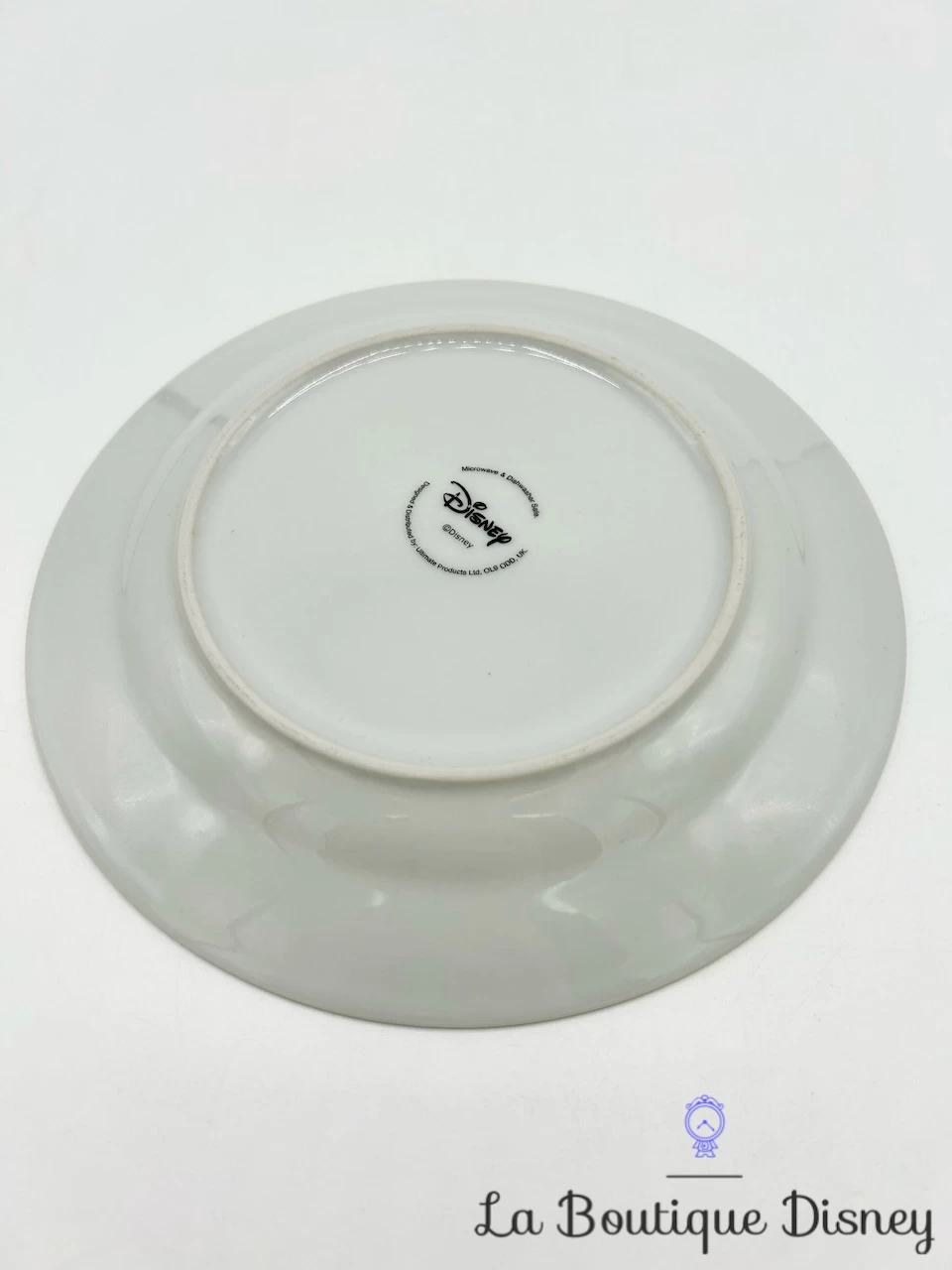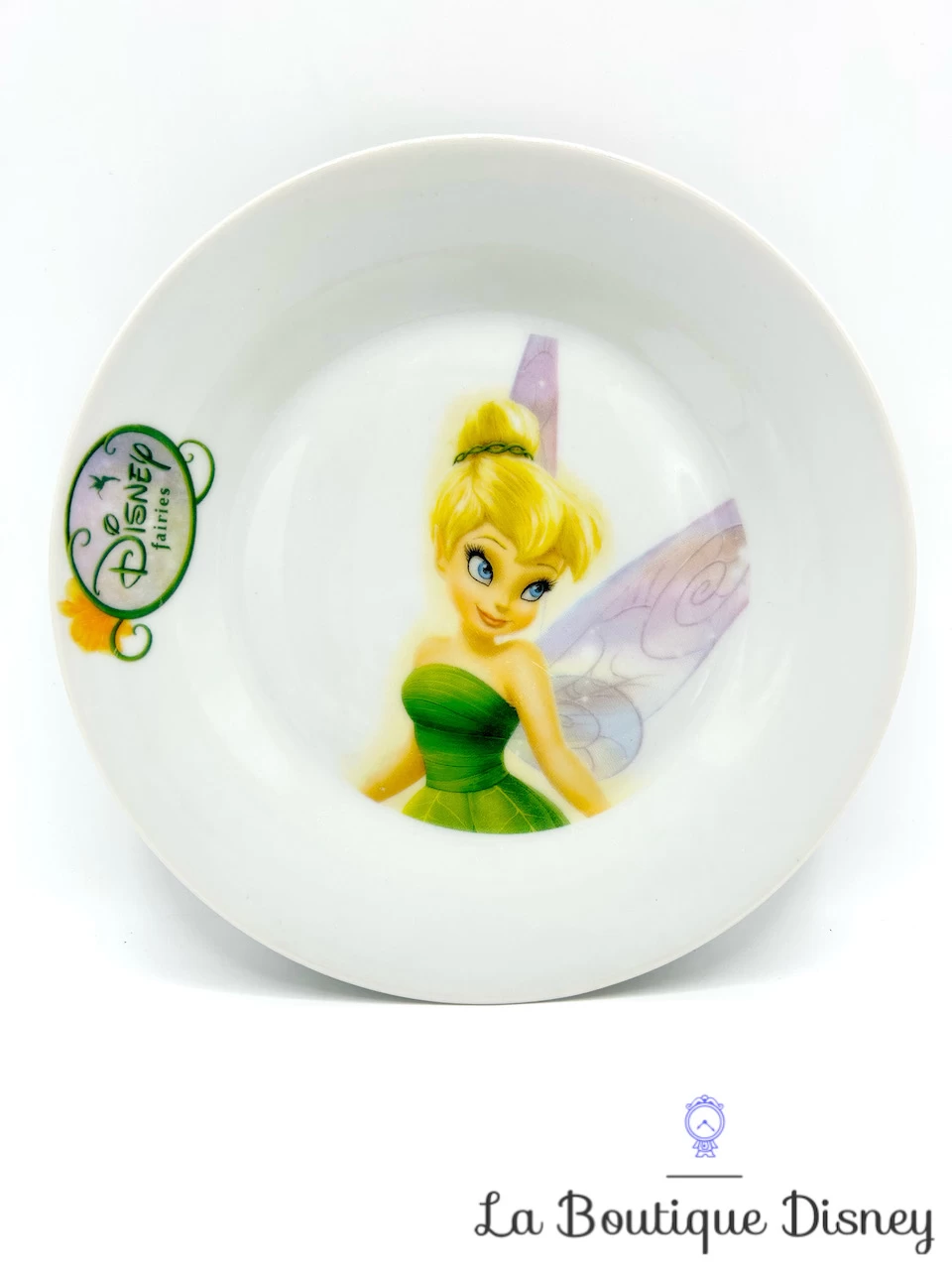 Assiette plate format assiette à dessert en céramique blanche. Sur le fond au centre, le buste de la Fée Clochette est imprimé. Elle porte sa robe verte habituelle et on aperçoit ses ailes mauves. Sur le côté de l’assiette, il y l’inscription dans un ovale « Disney Fairies ».