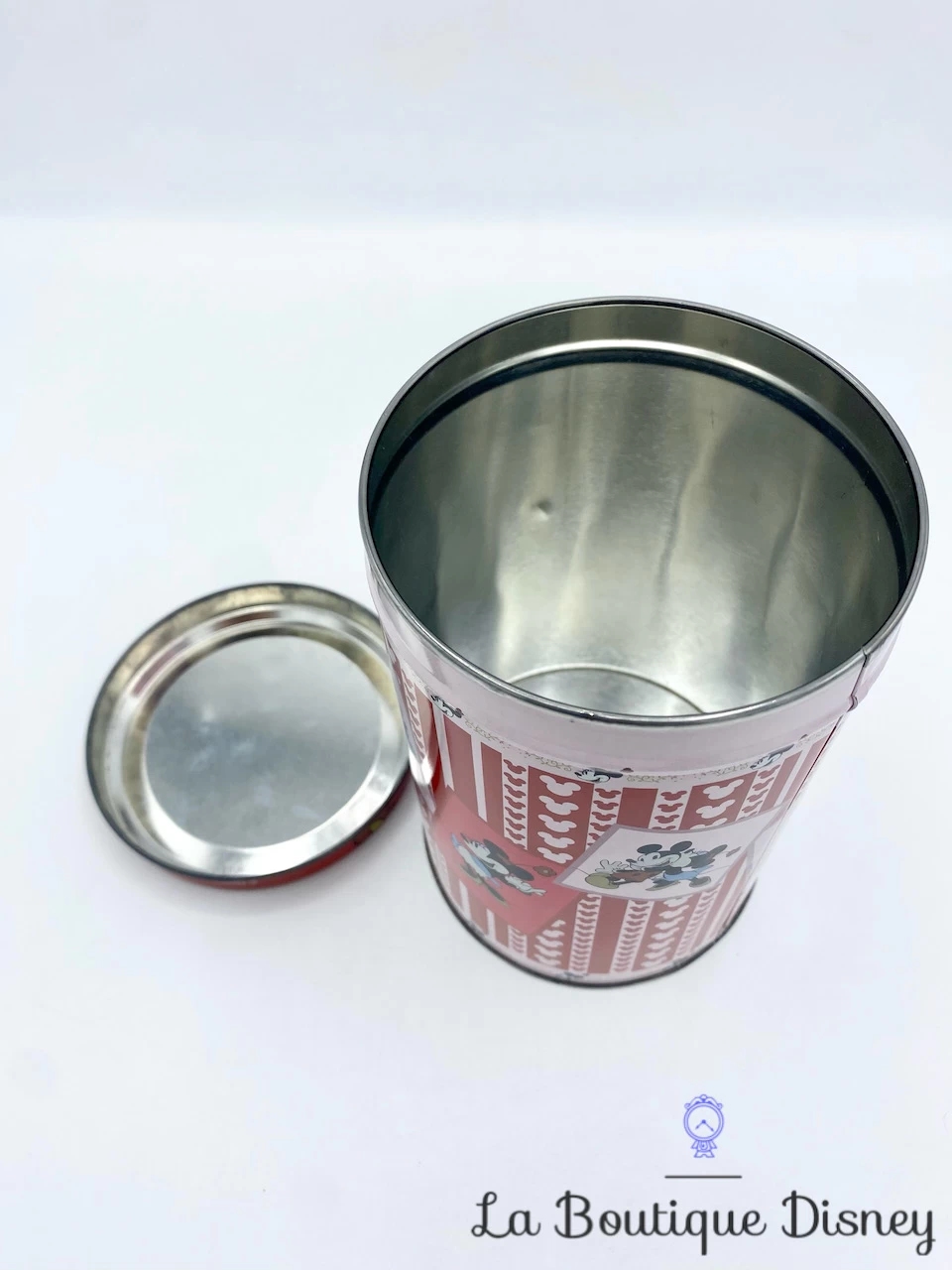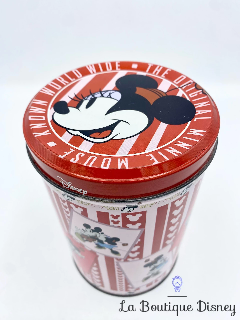 Boite en métal sur fond rouge et rose à l’effigie de la plus célèbre des souris Minnie Mouse. La boite est ronde / cylindrique. Le visage très souriant de Minnie est représenté sur le couvercle dans un style rétro vintage avec l’inscription « The original Minnie Mouse – Known World Wide ». Sur le tour de la boite il y a des bandes alternées rouges et rose pale recouvertes de têtes de Minnie ou Mickey. Différentes représentations de Mickey ou Minnie dans des carrés sont également présentes. Intérieur argenté. Contenait à l’origine des biscuits de type cookies.