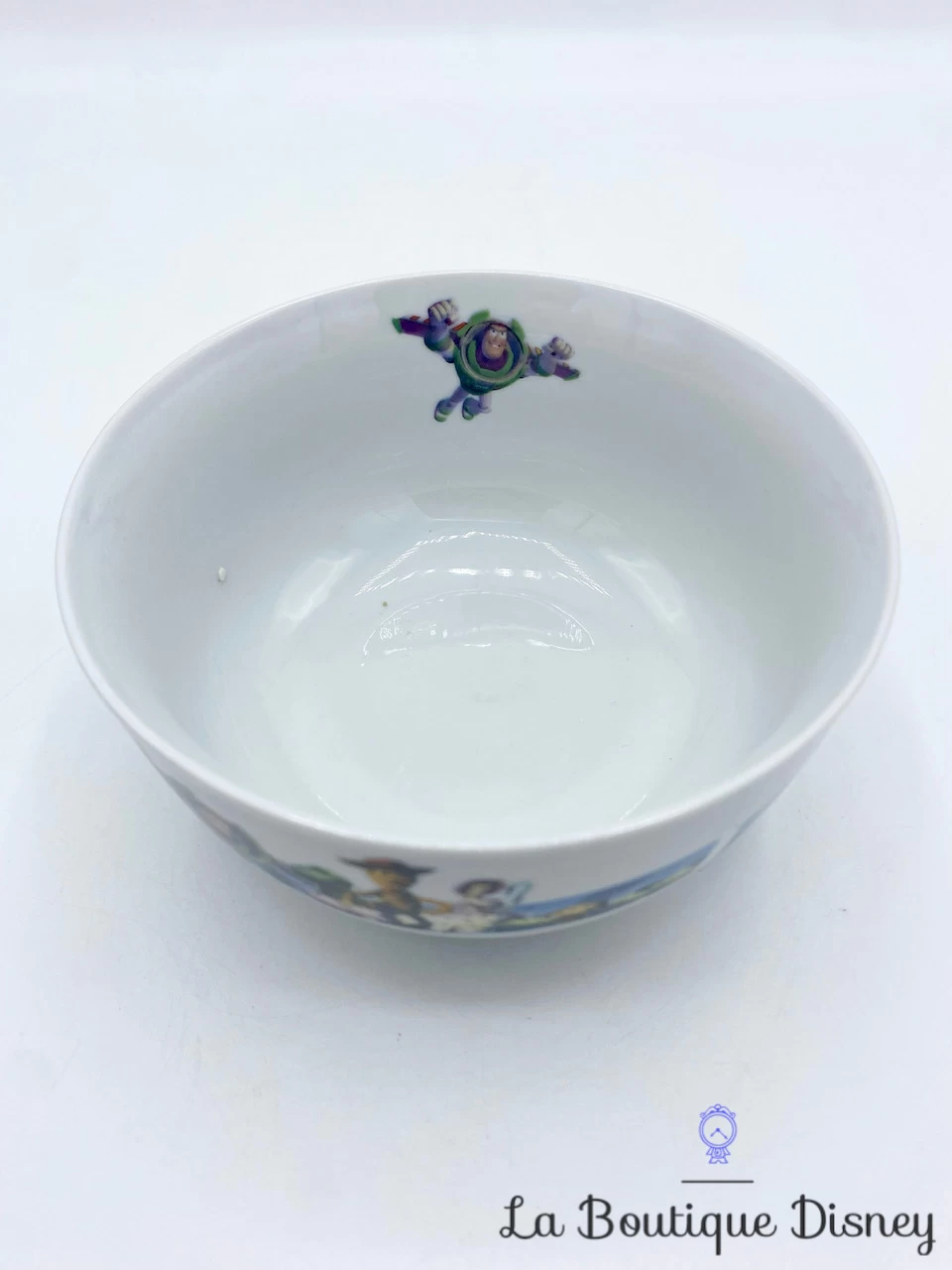 Bol en cĂ©ramique blanc avec plusieurs personnages du dessin animĂ© mis en scène : Woody le cow boy et son ami Buzz l’Ă©clair le space ranger de l’espace, Rex le dinosaure vert, Bayonne le cochon tirelire, Zig Zag le chien Ă ressort, les Aliens ou encore la Bergère Bo Peep ! Il y a une inscription en vert, orange et jaune « Buzz, Woody and the Gang ». IntĂ©rieur blanc avec un petit imprimĂ© de Buzz en plein vol.