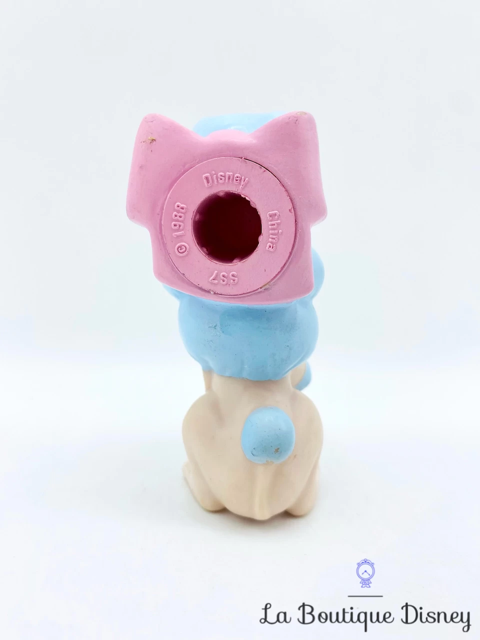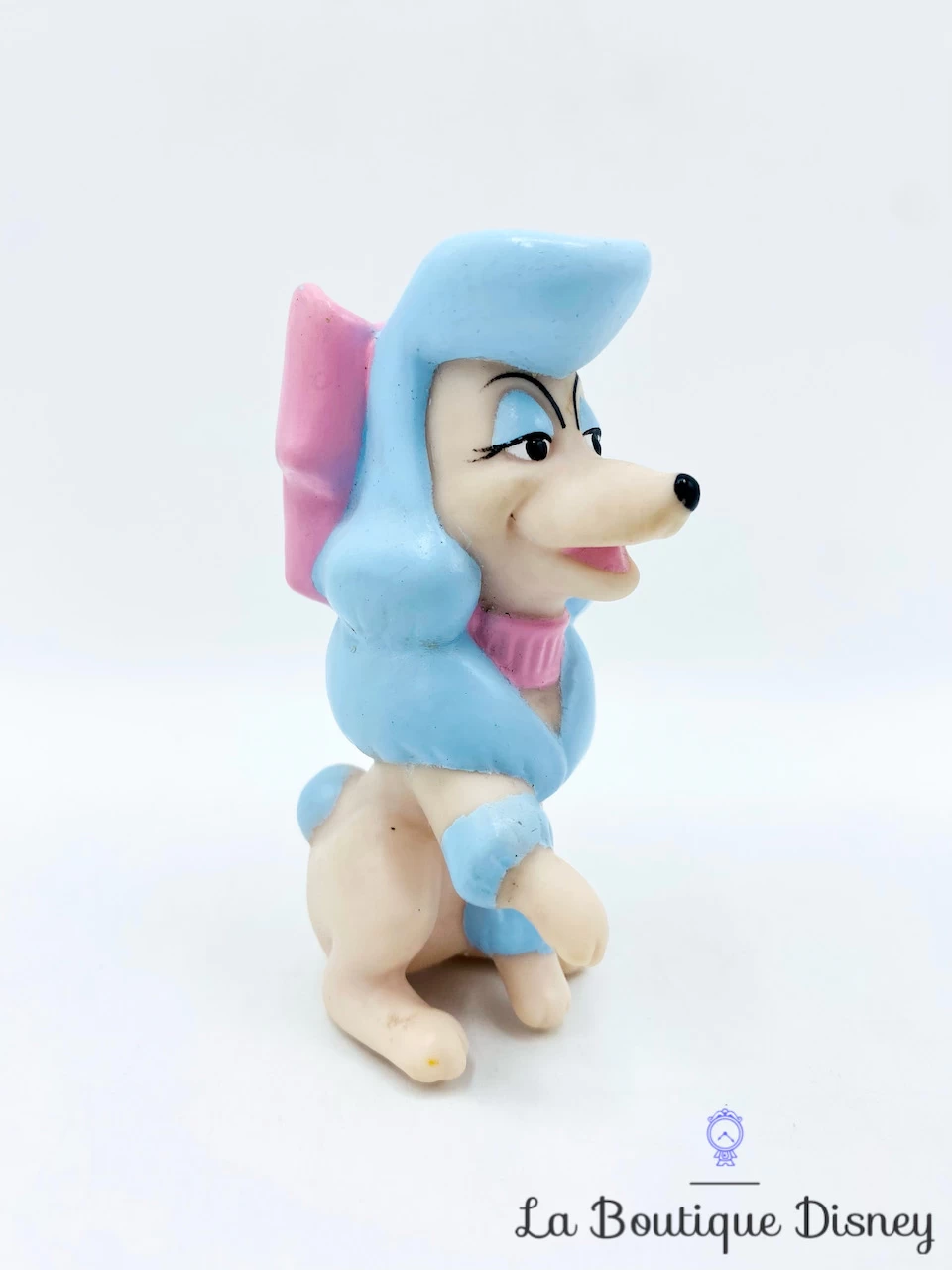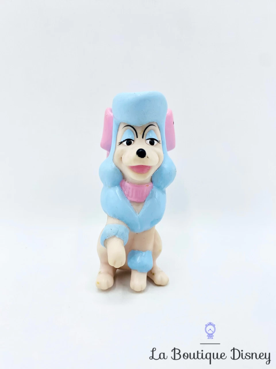 Figurine matière « pouet » de Georgette, le chien caniche blanc et bleu ciel avec un noeud rose autour du cou. Georgette est vaniteuse et obsĂ©dĂ©e par la perfection. Elle appartient Ă Jenny. Inscription sur l’arrière du noeud « Disney China SS7 1988 ». Trou Ă l’arrière de la figurine pour s’en servir comme un embout de crayon.