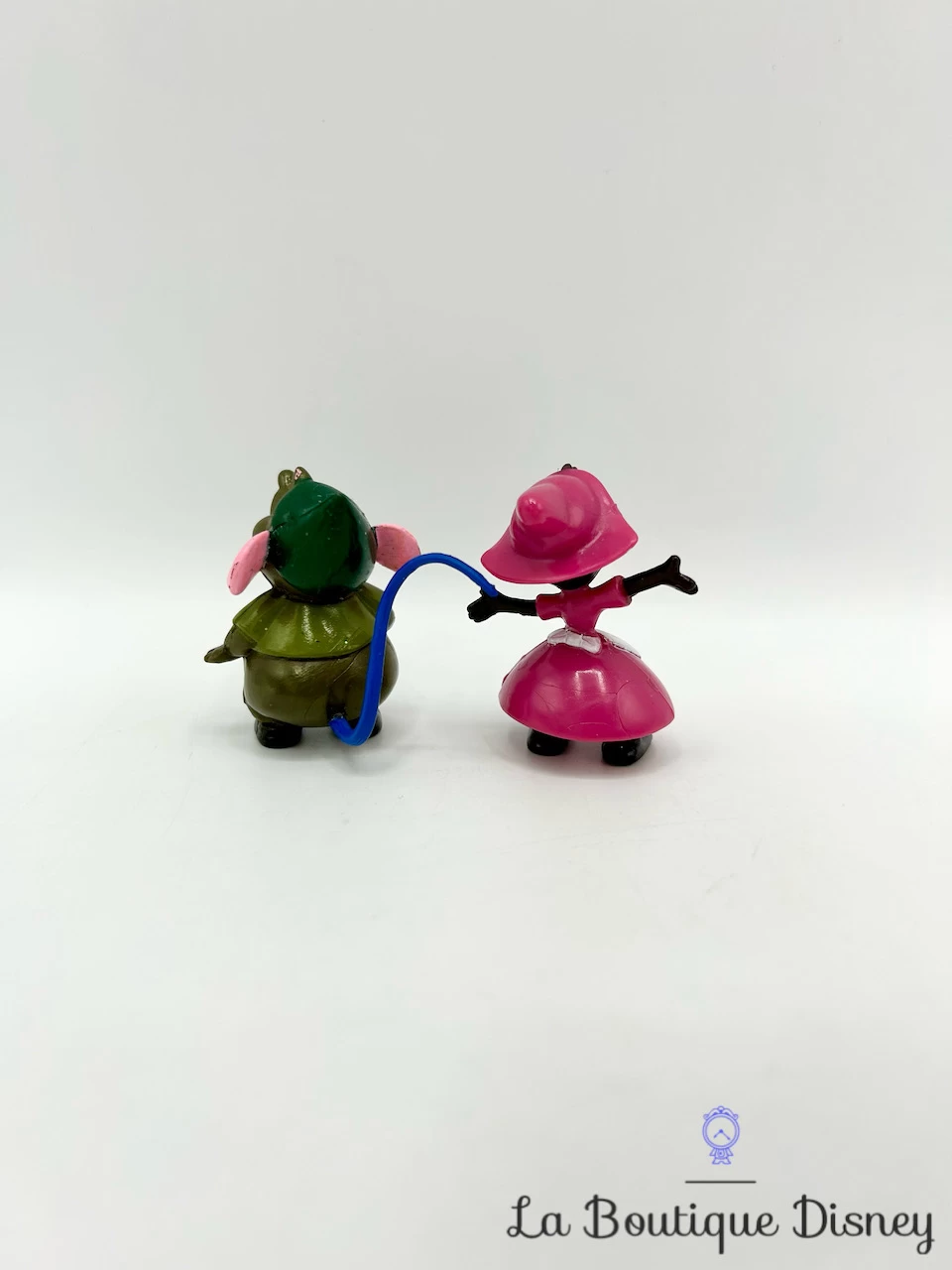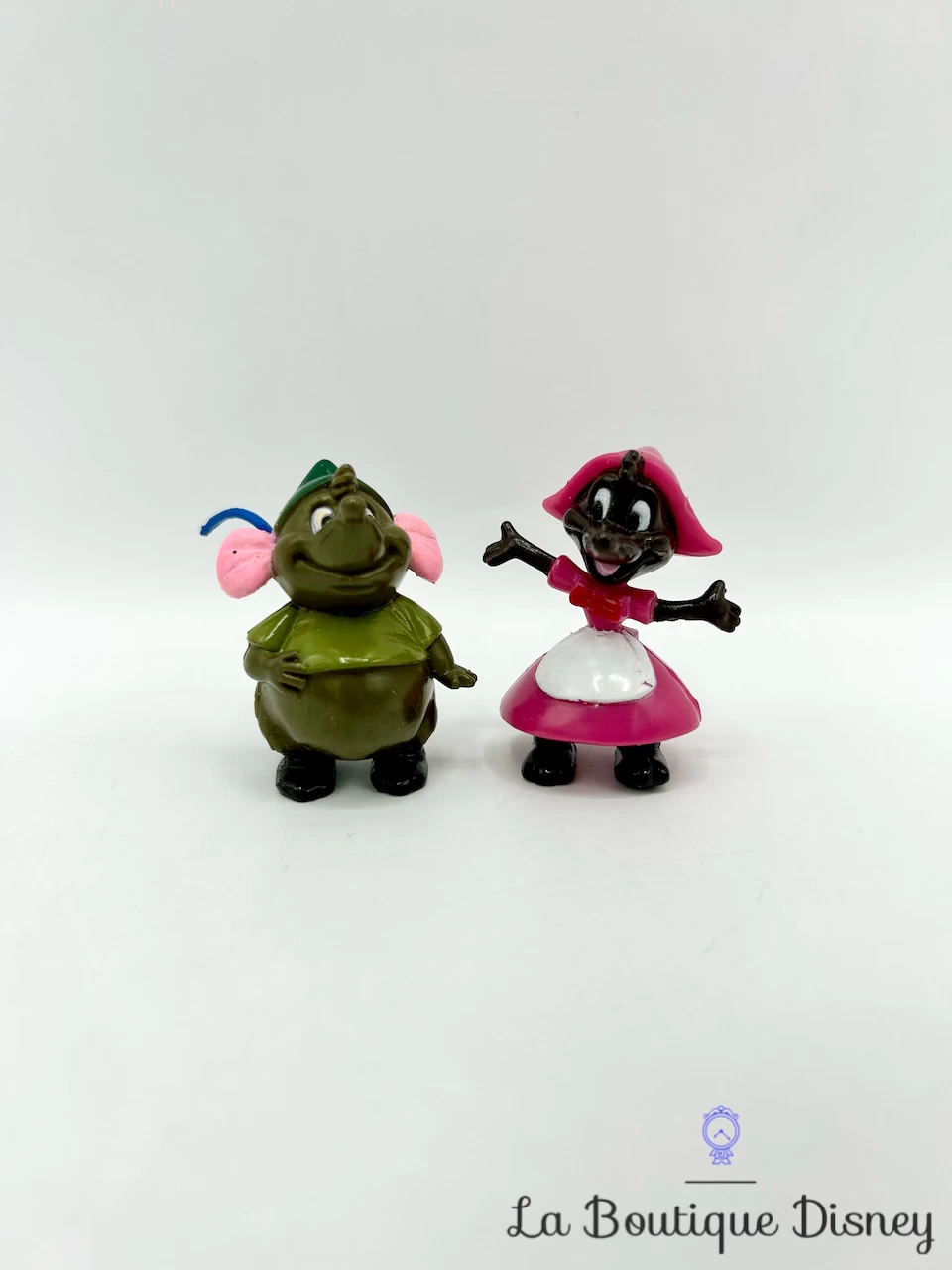 Figurines en plastique de deux petites souris prĂ©sentes dans le dessin animĂ© Cendrillon : Gus Gus la souris gourmande au tee-shirt vert et Perla la souris Ă la robe rose.Â