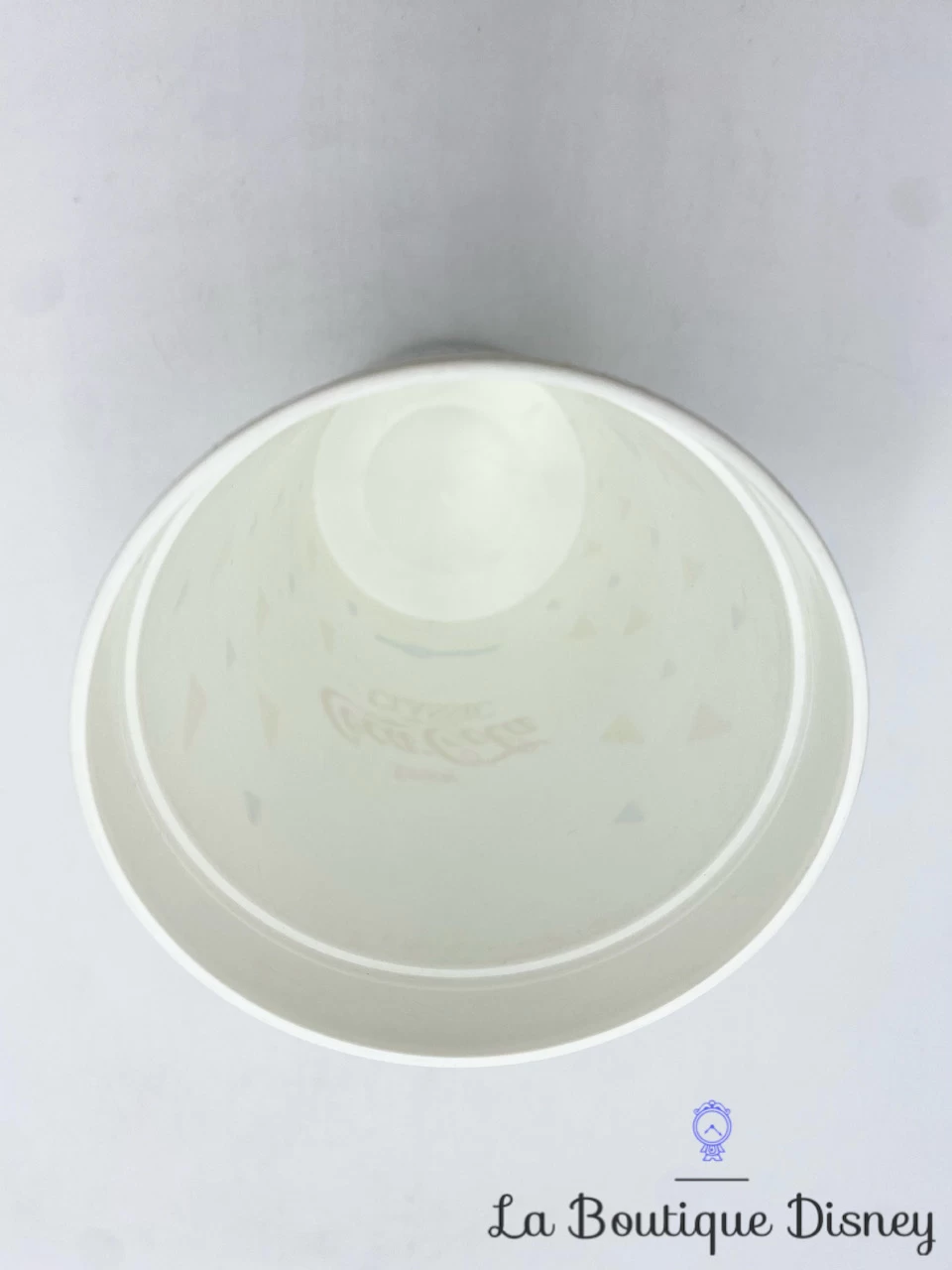 Gobelet en plastique blanc « cup » sur le thème de Mickey Mouse. Il est habillĂ© en tenue de cĂ©rĂ©monie avec un costume noir. Il se trouve devant un logo sur lequel il y a l’inscription « Mickey » et « Sixty Years with You ». IntĂ©rieur blanc.Â