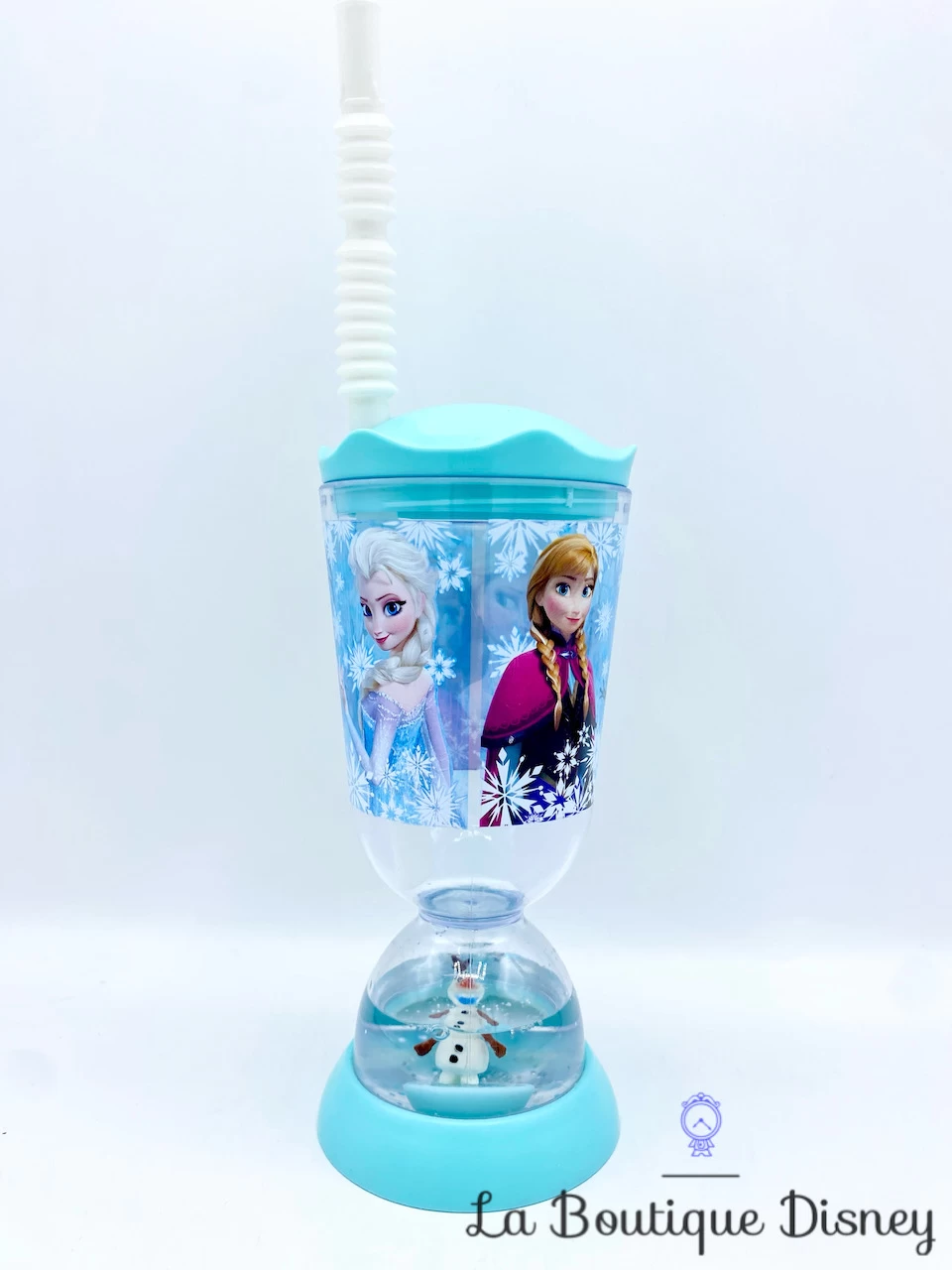 Gobelet bleu clair en plastique représentant les 4 personnages de La reine des neiges : les deux soeurs Anna et Elsa dans leurs tenues classiques du film et leurs deux acolytes Sven le renne et Olaf le bonhomme de neige. Il y a des flocons de neige tout autour d’eux. À la base du gobelet, il y a un espace avec de l’eau et une petite figurine d’Olaf qui flotte et qui bouge selon l’orientation du verre. Paille blanche sur le dessus. Couvercle amovible pour remplir et nettoyer l’intérieur du gobelet.