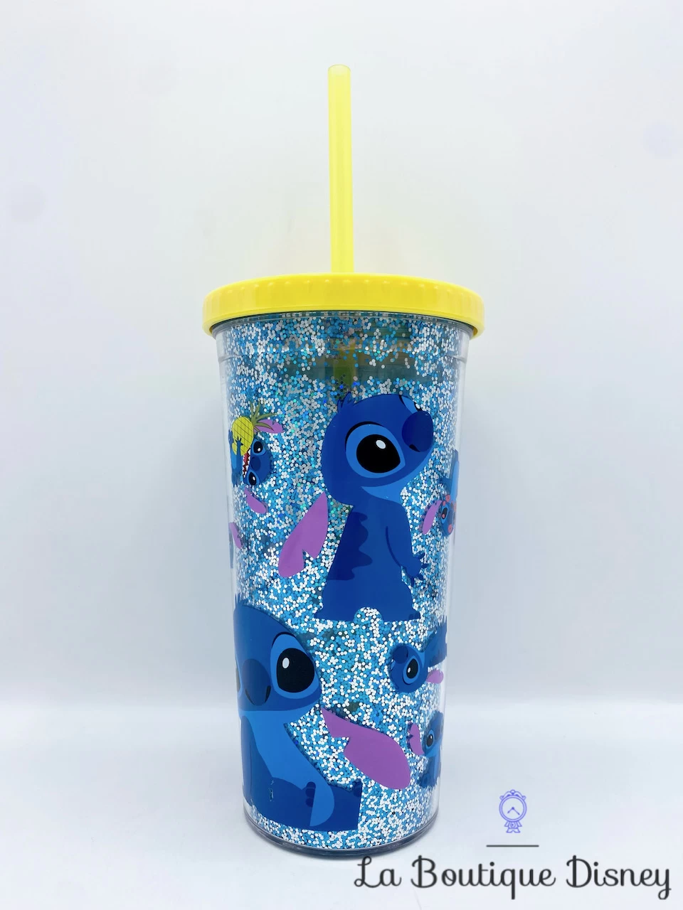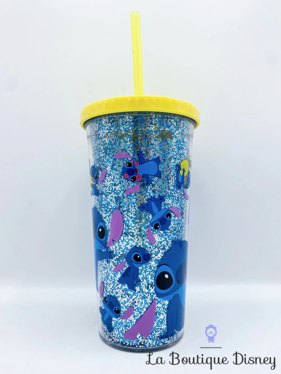 Gobelet bleu à paillettes en plastique représentant Stitch, le petit monstre extraterrestre bleu dans différentes positions. Parfois, il tient un ananas dans les mains. La qualité des dessins est très belle. Couvercle amovible jaune à travers duquel passe une paille jaune.