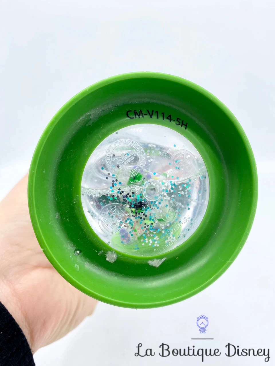 Gobelet vert en plastique représentant 4 personnages du dessin animé Toy Story : Buzz l’éclair le space ranger de l’espace, Woody le cow boy, Rex le dinosaure vert et un petit extraterrestre Alien. À la base du gobelet, il y a un espace avec de l’eau et une petite figurine de Buzz l’Éclair qui flotte et qui bouge selon l’orientation du verre. Paille blanche sur le dessus. Couvercle amovible pour remplir et nettoyer l’intérieur du gobelet.
