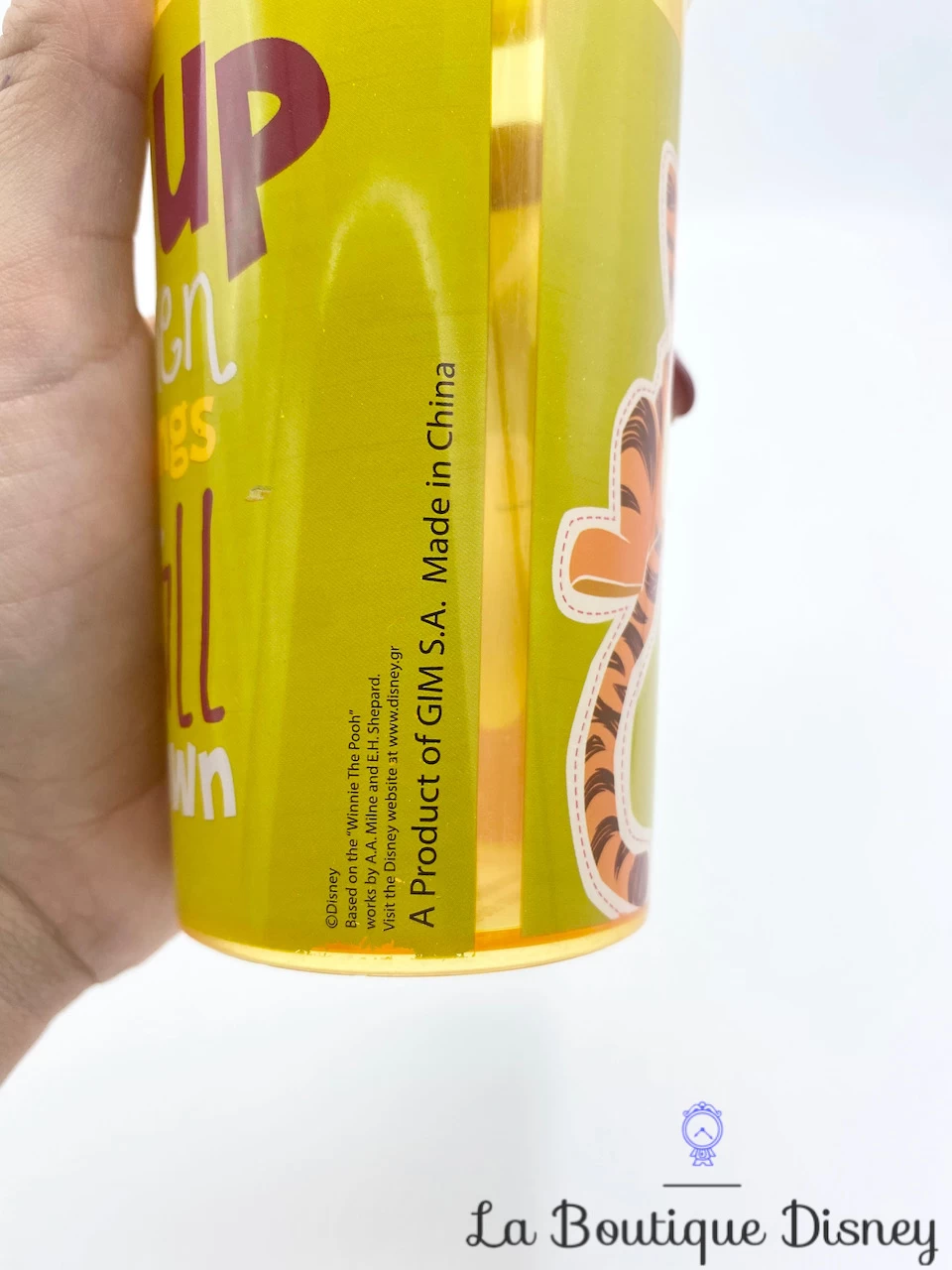 Gobelet vert jaune en plastique représentant Winnie l’ourson s’accrochant à un ballon avec une abeille posé sur son nez et son fidèle compagnon Tigrou en train de sauter de joie. Inscription à côté d’eux « Go up when things fall down » avec différentes polices d’écriture. Couvercle amovible avec paille en plastique blanche pouvant se ranger via un trou dans le verre.
