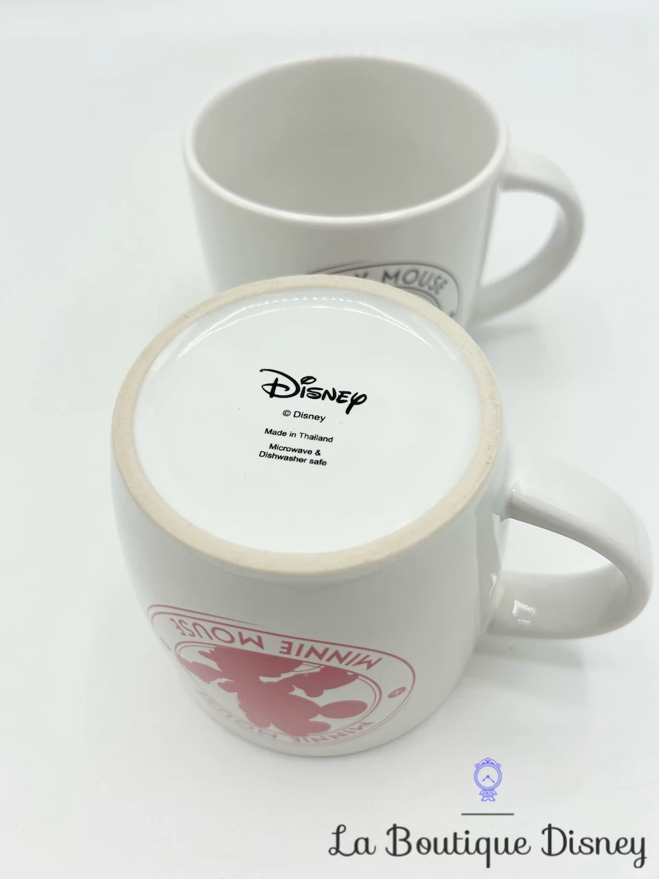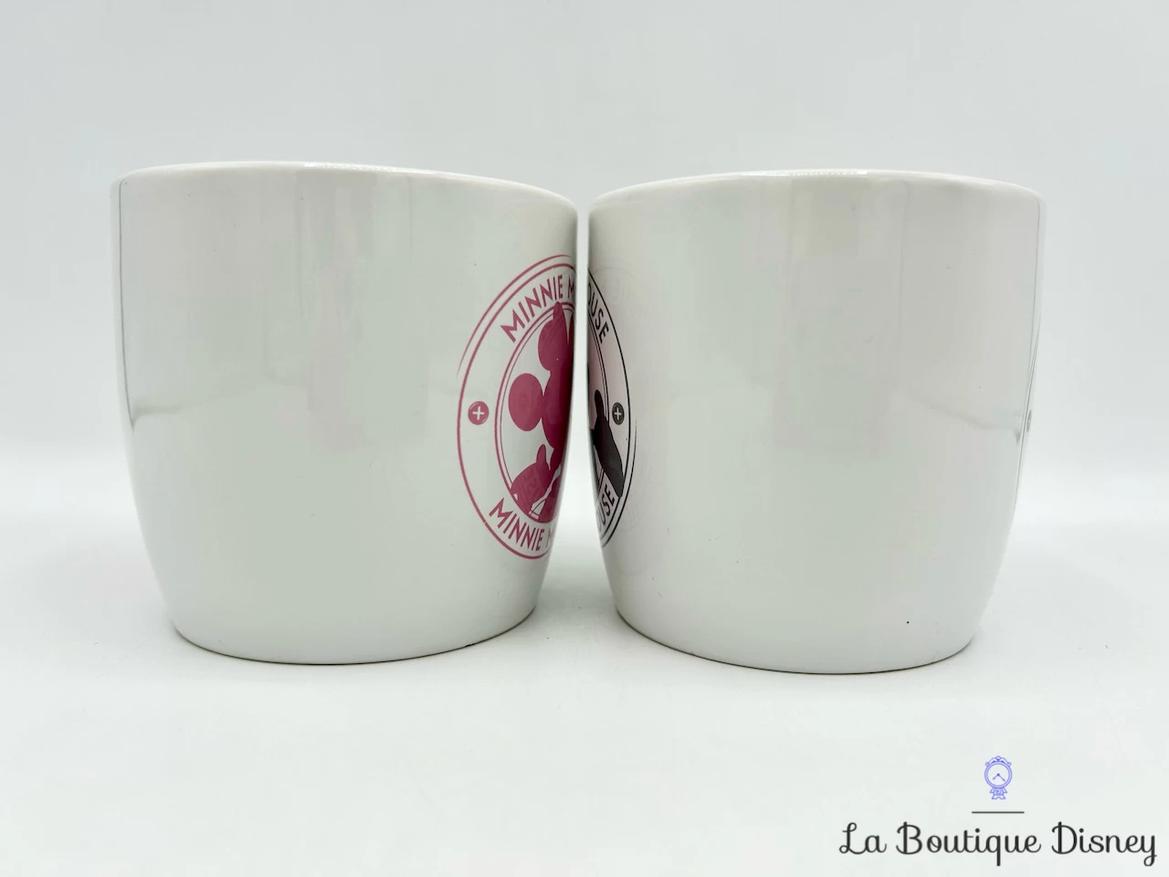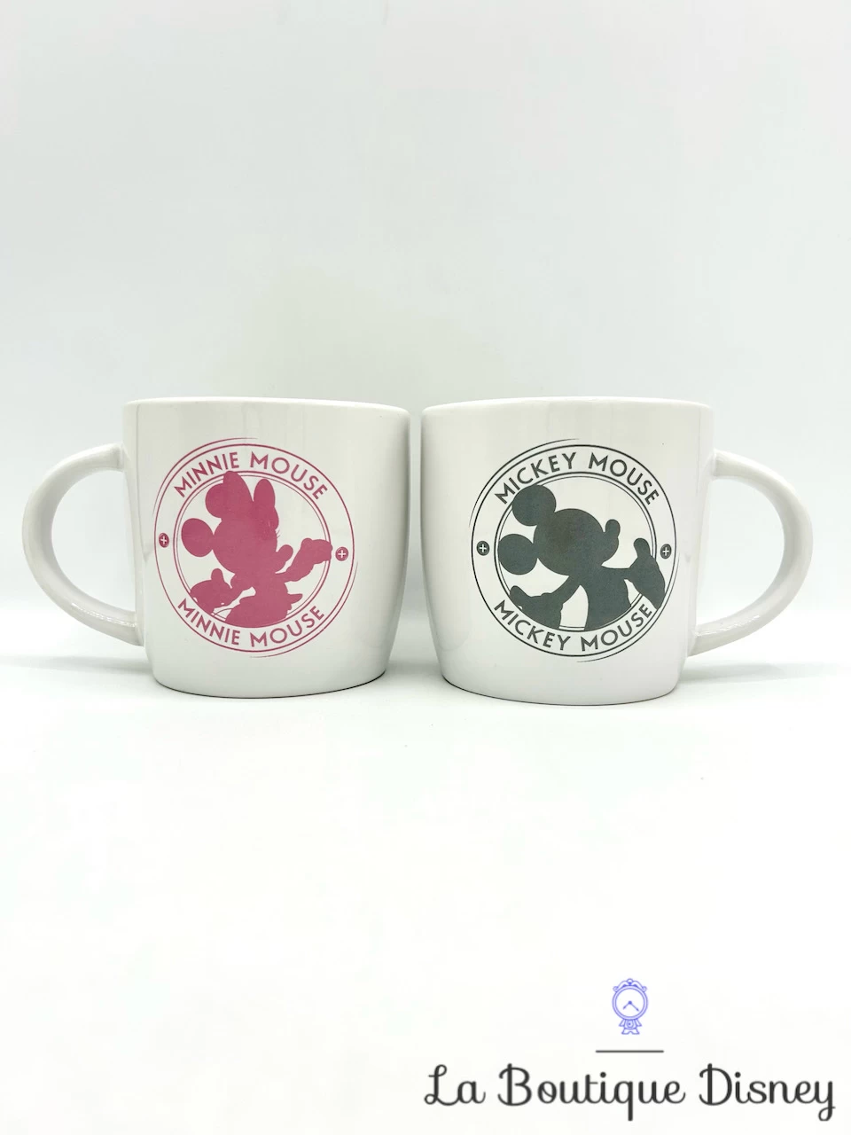 Duo de mugs en cĂ©ramique blancs avec les mĂŞme motifs mais de couleurs diffĂ©rentes. Celui de Mickey Mouse est gris et celui de Minnie Mouse est rose. Les cĂ©lèbres souris sont reprĂ©sentĂ©es dans un cercle avec autour d’eux l’inscription de leurs prĂ©noms. Les deux faces du mug sont identiques. Anses et intĂ©rieurs blancs.