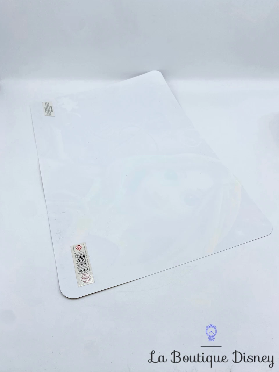 Set de table en plastique reprĂ©sentant la princesse Raiponce avec sa longue chevelure blonde et sa robe violette. A cĂ´tĂ© d’elle se trouve son ami le camĂ©lĂ©on vert Pascal. Derrière eux, il y a la grande de tour de Raiponce ainsi que l’inscription en violet « Rapunzel ». Le dos du dessous de table est blanc.