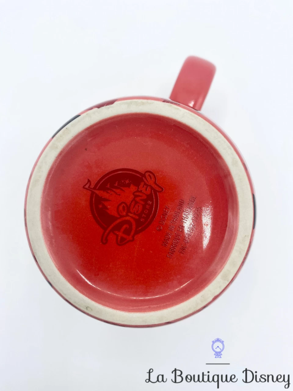 Mug en céramique rouge et noir avec une toute petite poignée sur le côté. Sur la première face, il y a un petit chien noir et blanc couché sur le ventre avec les pattes croisées. Sur l’autre face, il y a en noir l’inscription « 101 Dalmatians » avec une empreinte de patte à l’intérieur du « 0 ». Le fond de la tasse est rouge avec des tâches noires comme sur les chiots, et des motifs d’os, de pattes, de gammelles… Anse et intérieur rouges.