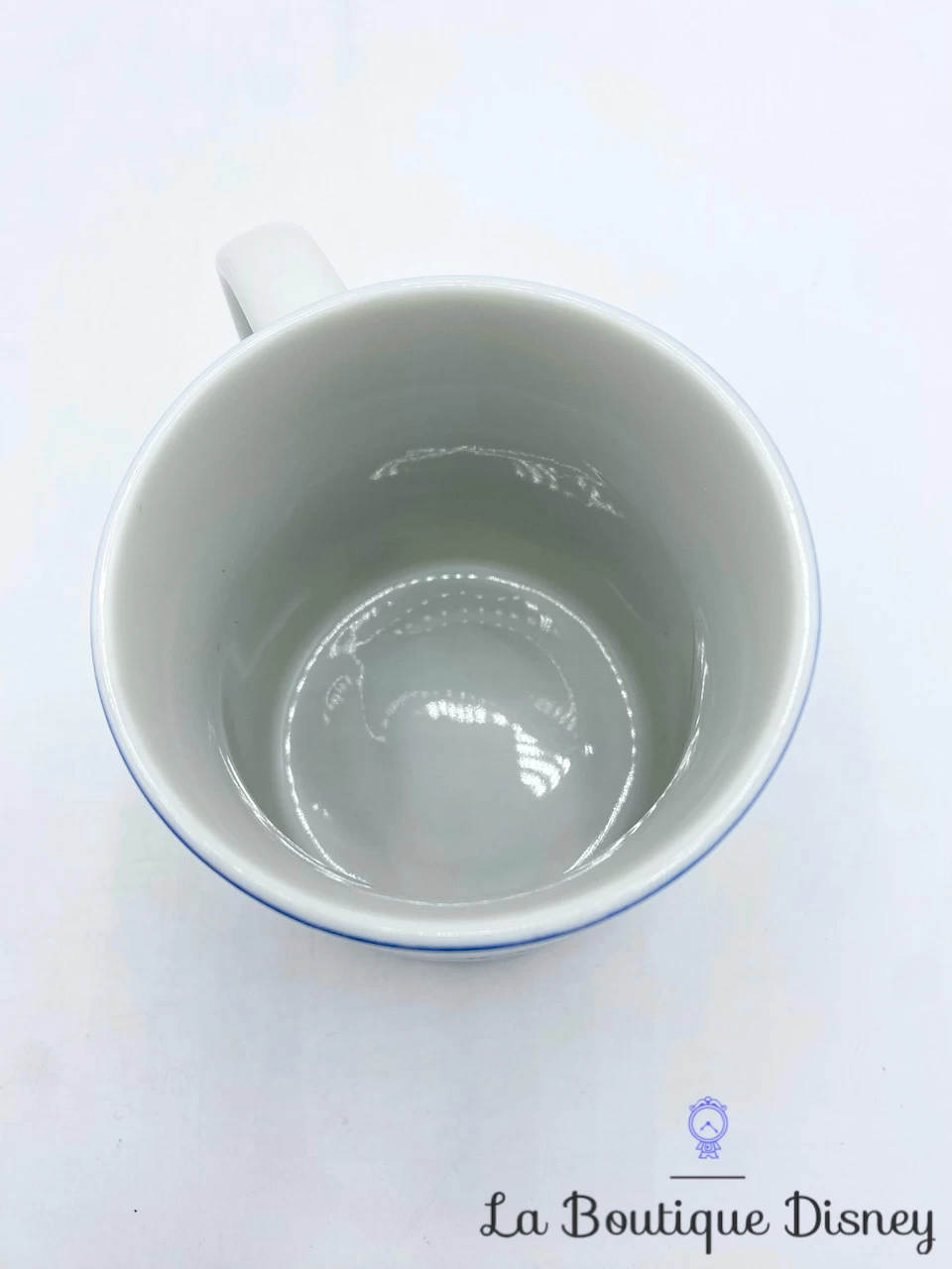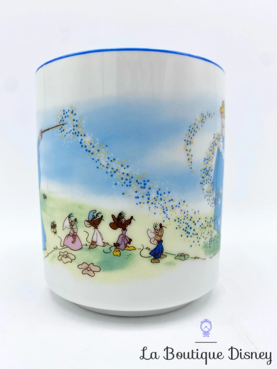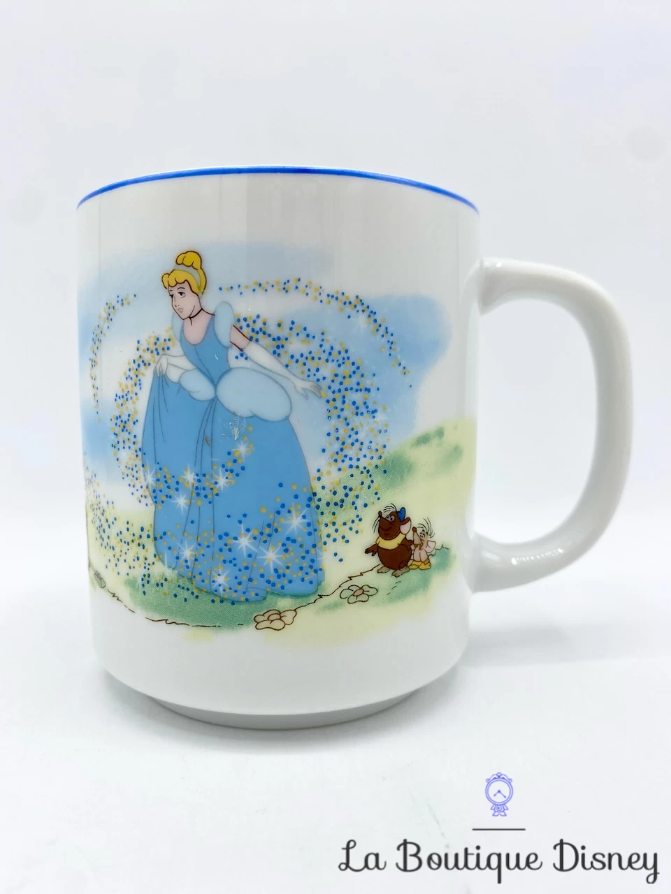 Mug en céramique blanc avec une bordure bleue représentant Cendrillon, la princesse avec sa robe de bal bleue. La marraine la fée est en train de la transformer en princesse avec sa baguette magique. On aperçoit également derrière le carrosse ainsi que divers animaux comme Lucifer, ou encore les petites souris. La scène se déroule tout au long de la tasse, comme dans les tasses scènes Disney. Anse et intérieur blancs. Très belle qualité des dessins !