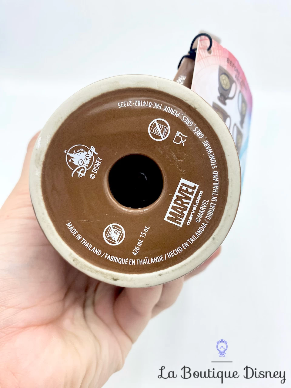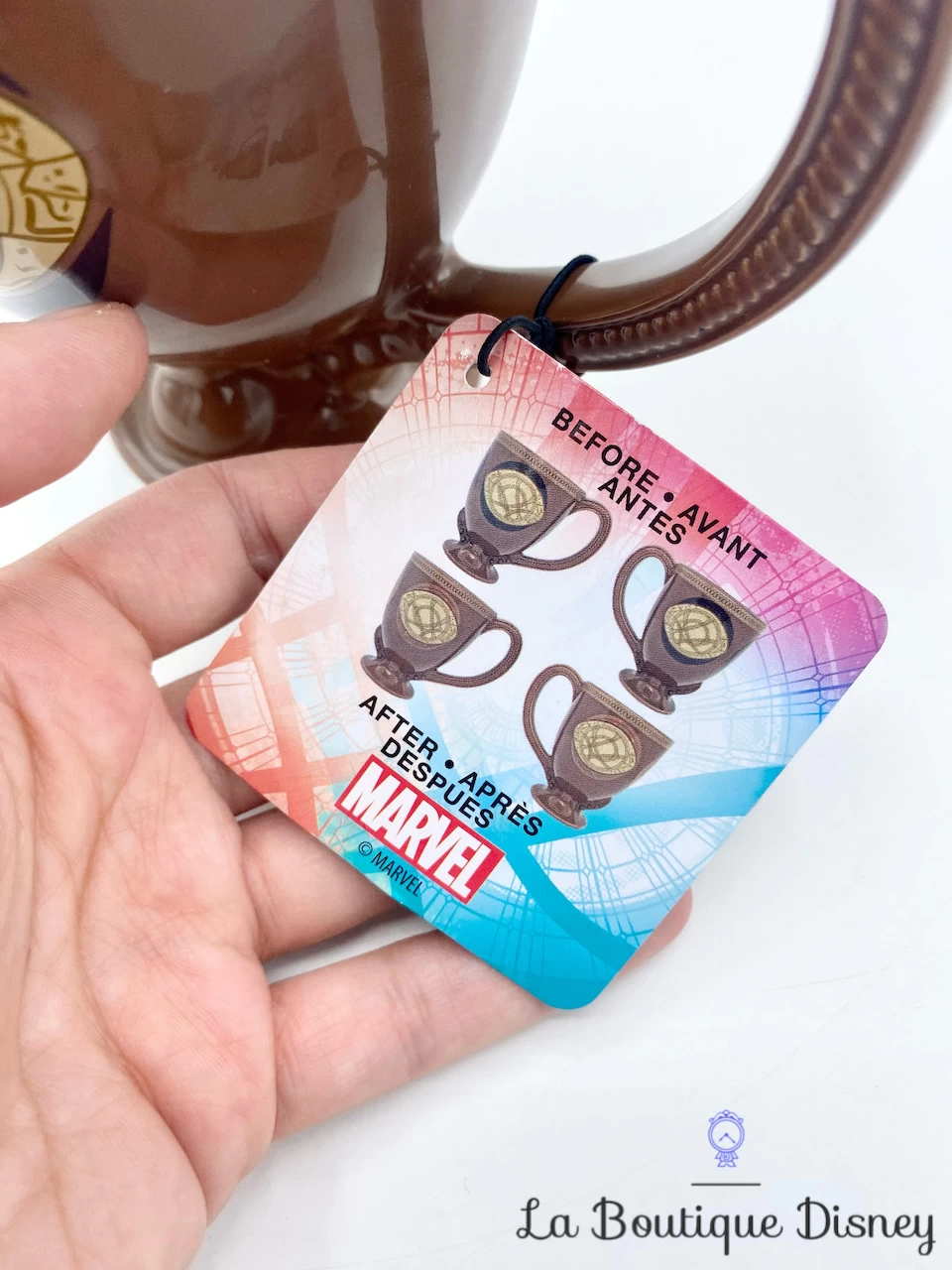 Mug en grès marron en relief 3D sur le thème de Doctor Strange. Sur la tasse est représenté l’Oeil d’Agamotto. Les deux faces du mug sont identiques. Intérieur et anse de la tasse marron. Le liquide chaud révèle l’oeuvre cachée autour de l’oeil !