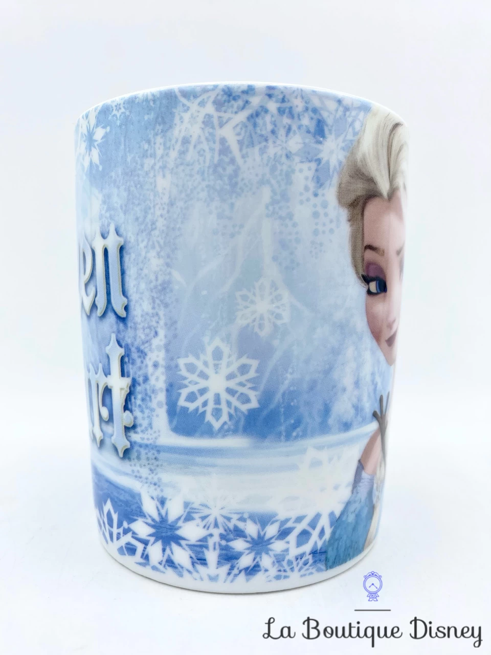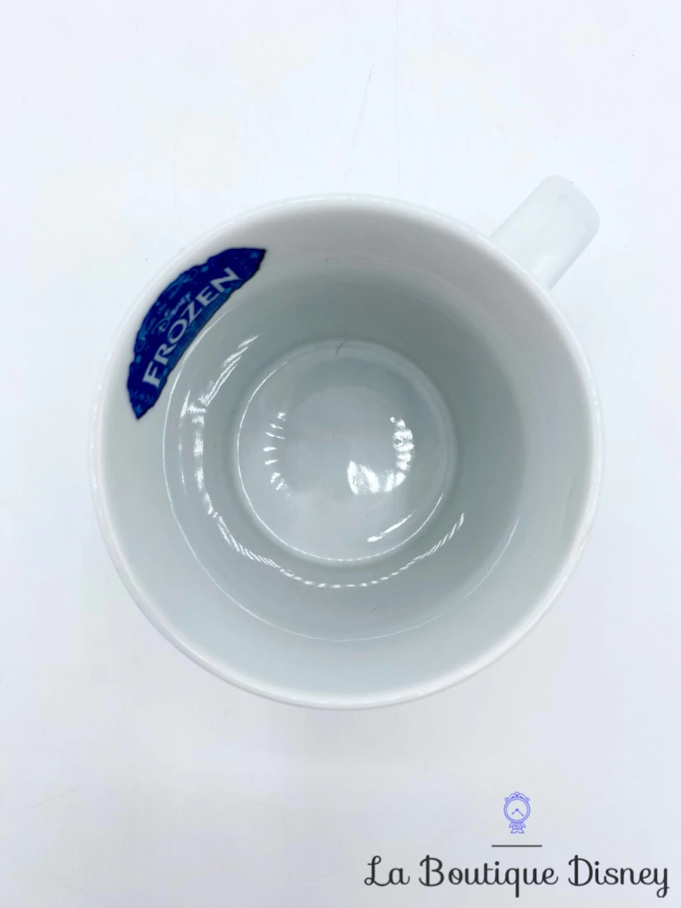 Mug blanc et bleu représentant la reine Elsa dans sa tenue de princesse. Elle a de beaux yeux bleus et une longue chevelure blonde avec une tresse. Elle est accompagnée de son ami, le bonhomme de neige Olaf. Autour d’eux se trouvent des flocons de neige blancs. Sur l’autre face, il y a l’inscription « Frozen Heart » en blanc avec une très belle police d’écriture. Inscription « Disney Frozen » à l’intérieur du mug. Anse et intérieur blancs.