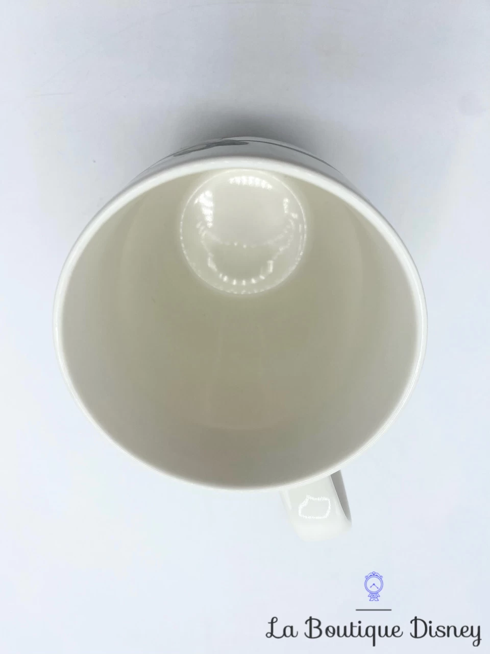 Mug en céramique blanc de Mickey et ses amis. Mickey, Minnie, Dingo, Pluto, Donald et Daisy sont représentés à la façon d’un dessin colorié de très belle qualité. Ils sont réunis autour d’une table en train de déjeuner. Un pot vert est renversé à cause de Pluto qui tire la nappe de la table.
