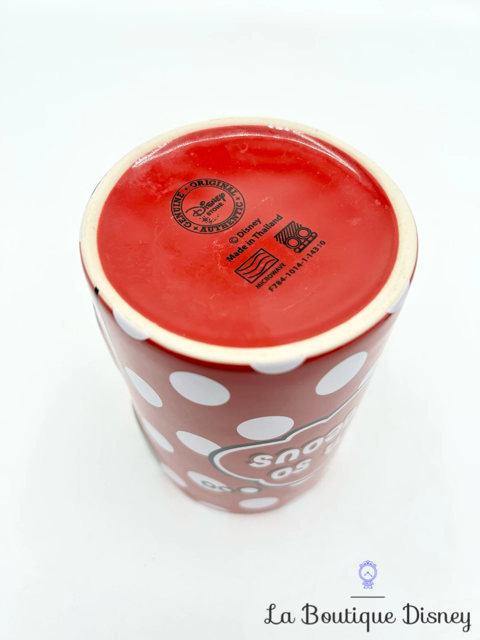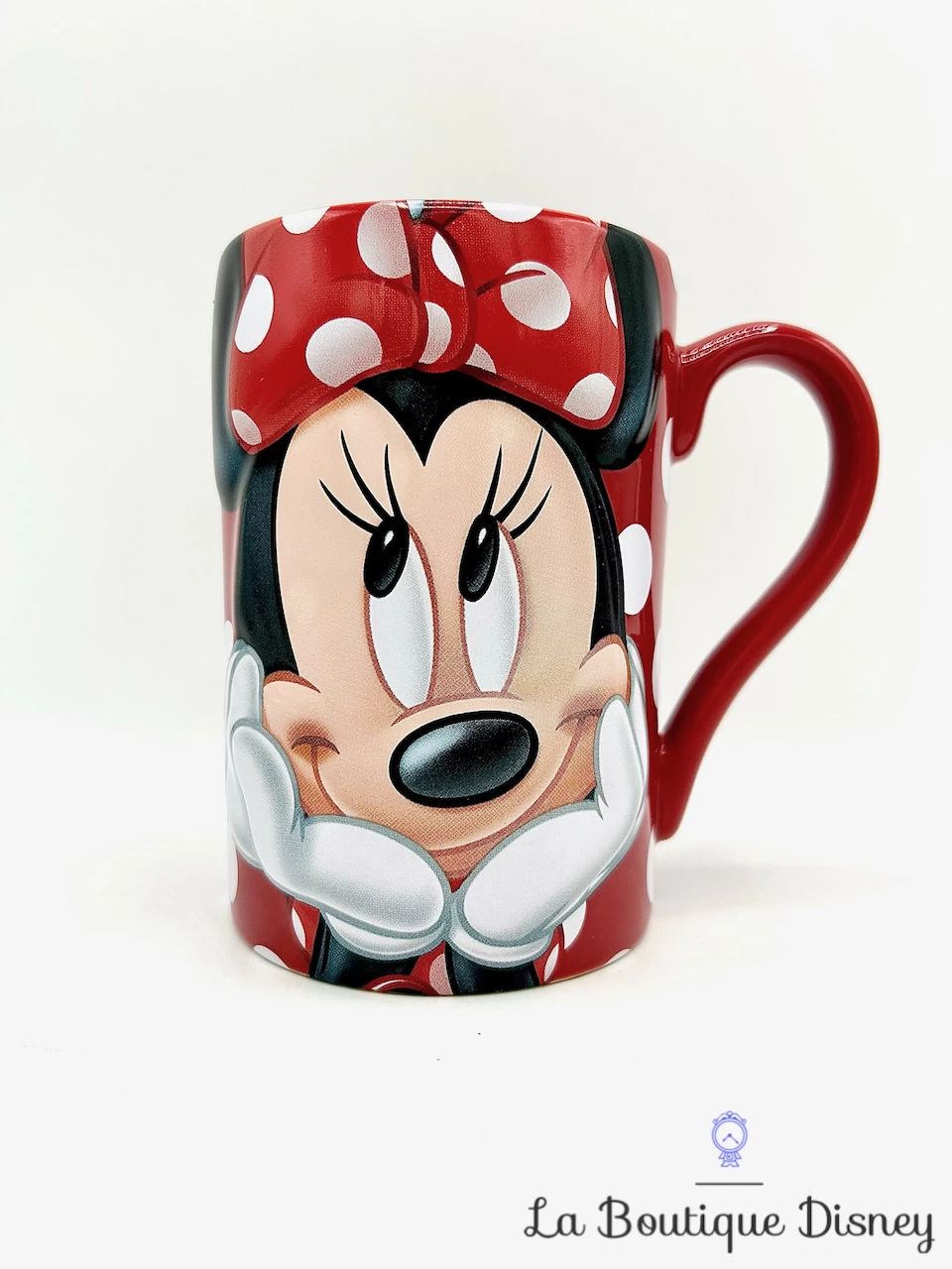 Mug en céramique rouge à pois blancs représentant notre souris préférée, Minnie Mouse en gros plan. Elle porte son noeud habituel et a sa tête posée entre les mains. Au dos de la tasse, inscription « I am so gorgeous ». Anse et intérieur rouges.