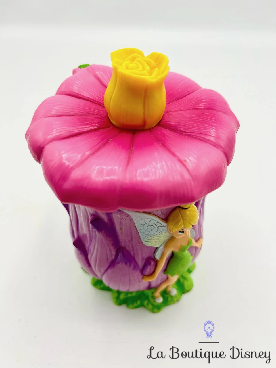 Verre en plastique de la Fée Clochette. Ce gobelet est de couleur violet avec une inspiration de motifs fleurs et avec des feuilles vertes à sa base. La fée Clochette est sur le dessus en relief avec sa robe verte. Le couvercle rose à la possibilité de s’ouvrir et de se refermer. Intérieur violet. Anse verte en « feuille ».