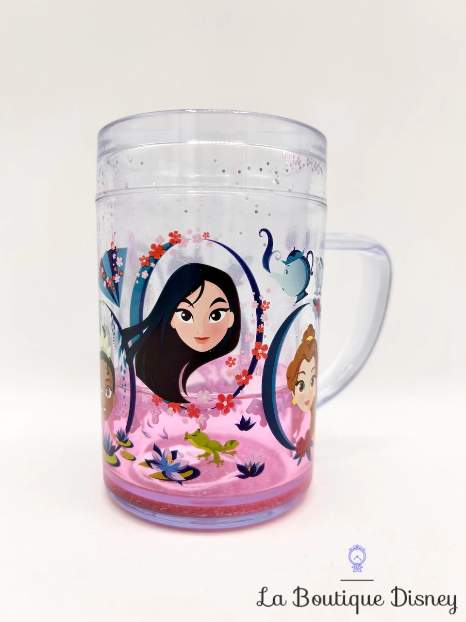 Mug plastique rose et transparent sur le thème des Princesses. Des dessins en fond représentent les visages de différentes princesses : Mulan, Cendrillon, Tiana, Jasmine et Belle. Il y a également des petits motifs avec le prince Naveen en grenouille, Madame Samovar, la pantoufle de verre, un éventail ou encore le Génie de la lampe. La tasse possède une « double paroi » dans laquelle se trouvent de l’eau et des petites paillettes qui se mettent en mouvement quand vous bougez la tasse.