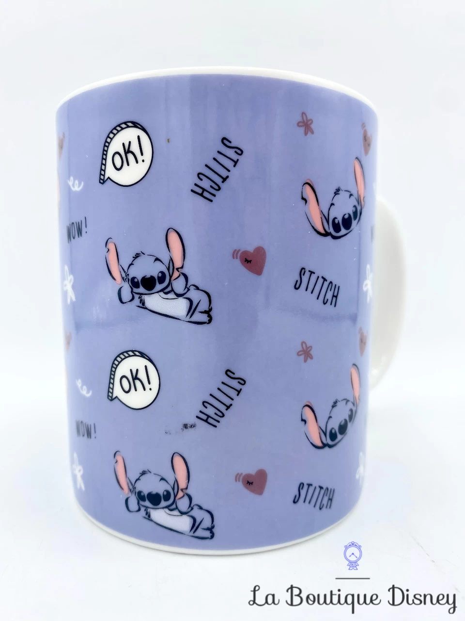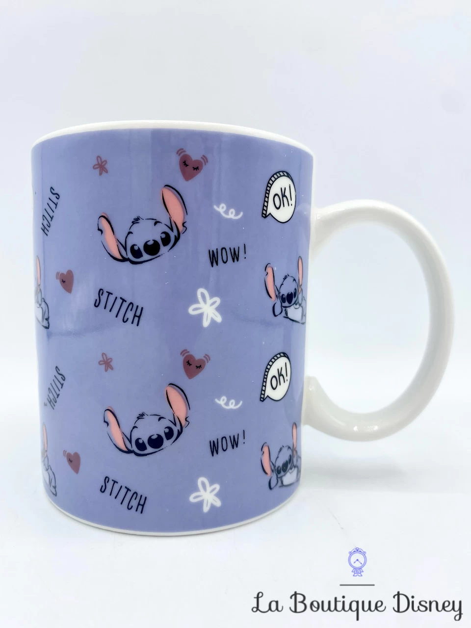 Mug en céramique bleu violet représentant de nombreuses fois Stitch, le petit monstre extraterrestre. Autour de lui, il y a des motifs de coeurs et de fleurs ainsi que les inscriptions « Wow », « Stitch » et « Ok ». Anse et intérieur blancs.