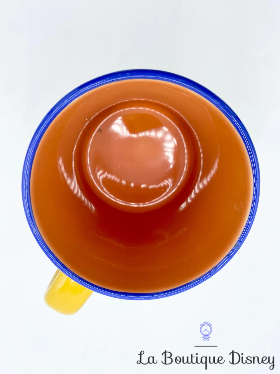 Mug en cĂ©ramique jaune bordĂ© de bleu avec le plus cĂ©lèbre des oursons reprĂ©sentĂ© en image , Winnie. Avec en arrière plan un rectangle sur fond vert et bleu reprĂ©sentant l’herbe et la pelouse, Winnie est vĂŞtu de son petit pull rouge et se promène gaiement. C’est comme s’il Ă©tait en photo. Les deux faces du mug sont identiques. Anse jaune et intĂ©rieur orange.