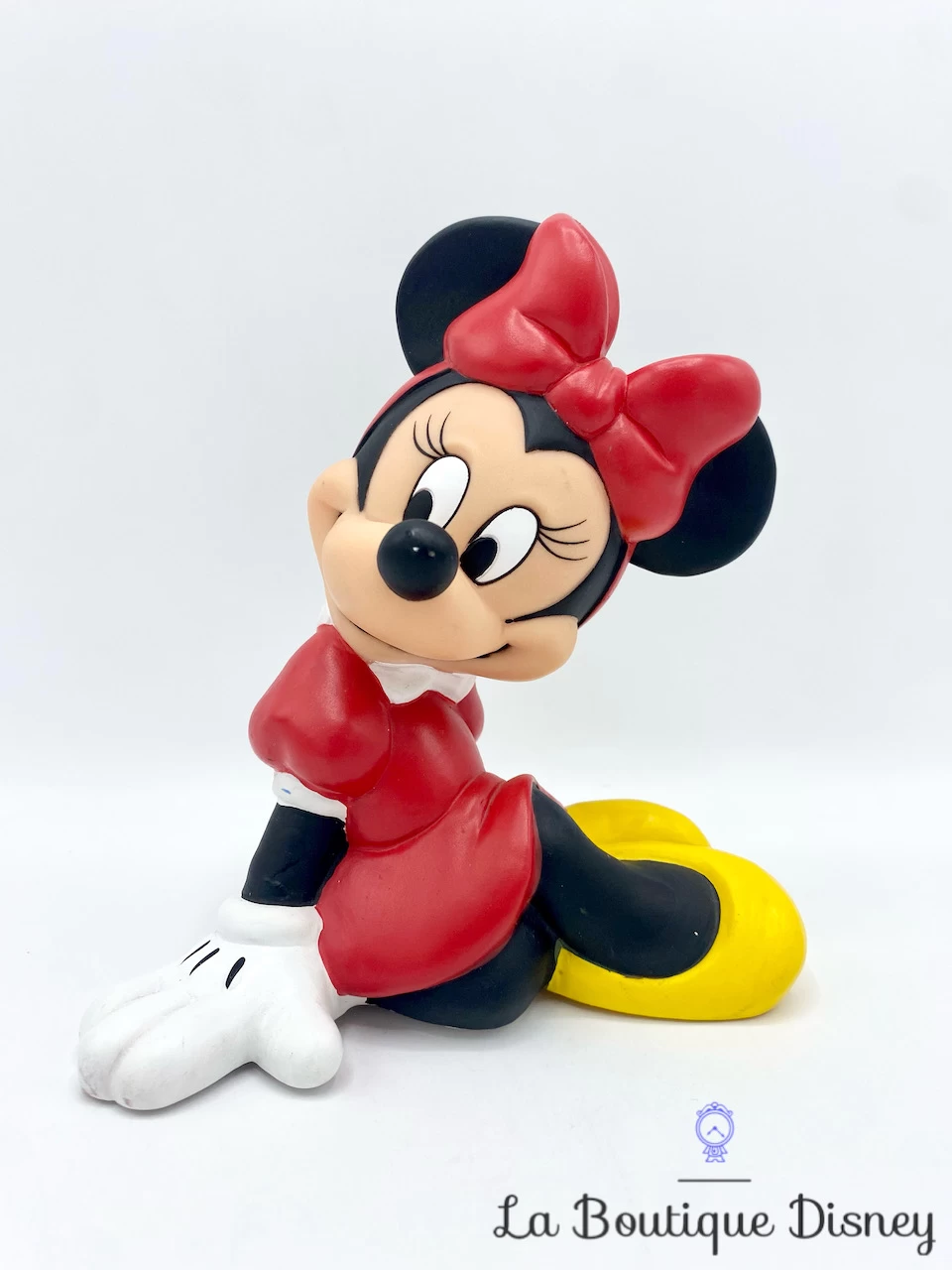 Tirelire en plastique dur reprĂ©sentant la cĂ©lèbre souris Minnie Mouse. Minnie est assise les bras en arrière. Elle porte une robe rouge et un noeud rouge sur la tĂŞte. Une fente est situĂ©e sur l’arrière de la tirelire et on note un bouchon rĂ©cupĂ©rateur en dessous.Â