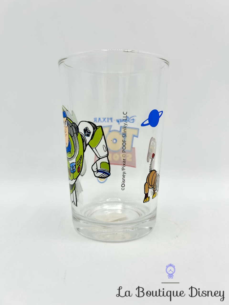 Verre à moutarde représentant Buzz l’éclair, le space rangers de l’espace, ainsi que Zig Zag, le chien à ressort. Sur le tour du verre se trouvent des planètes bleues. Inscription « Toy Story » avec la typographie habituelle du film. Matière : verre.
