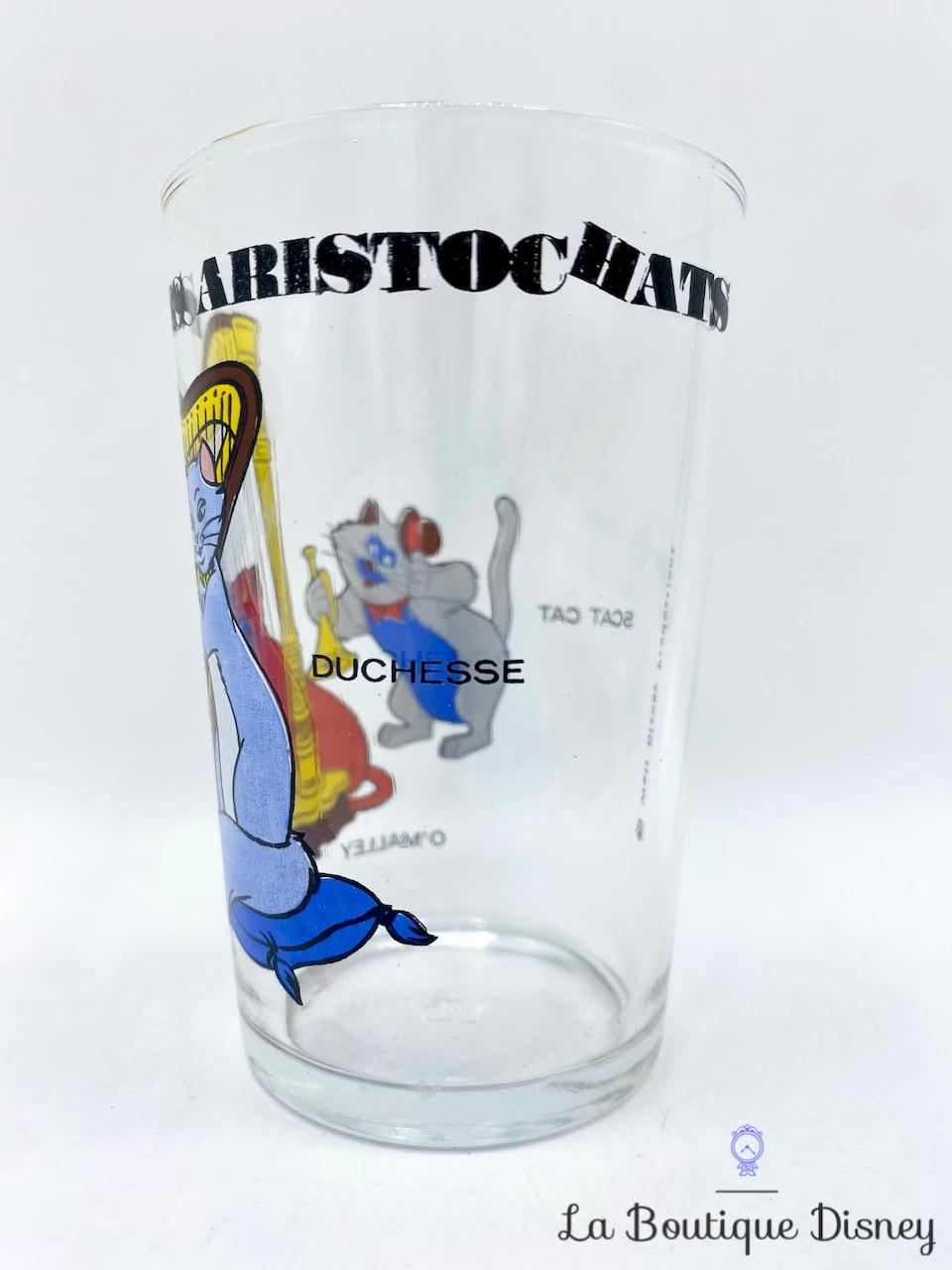 Verre représentant 3 des personnages du dessin animé Les Aristochats : Thomas O’Malley le chat de gouttière orange, Duchesse la mère de famille en train de jouer de la harpe, et Scat Cat le dirigeant du groupe de jazz. Sur le haut du verre, il y a une inscription noire « Les Aristochats » ainsi que les prénoms des chats. Matière : verre.