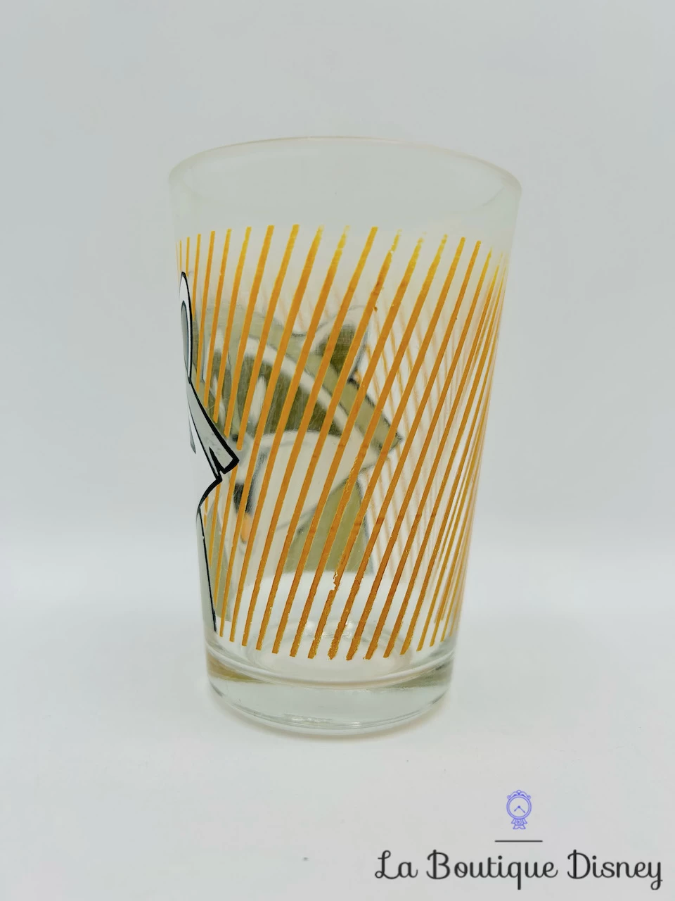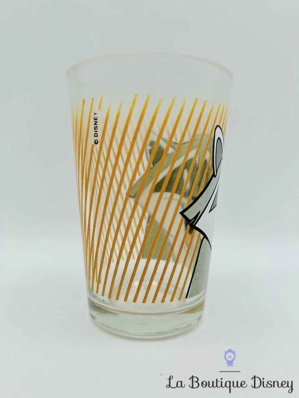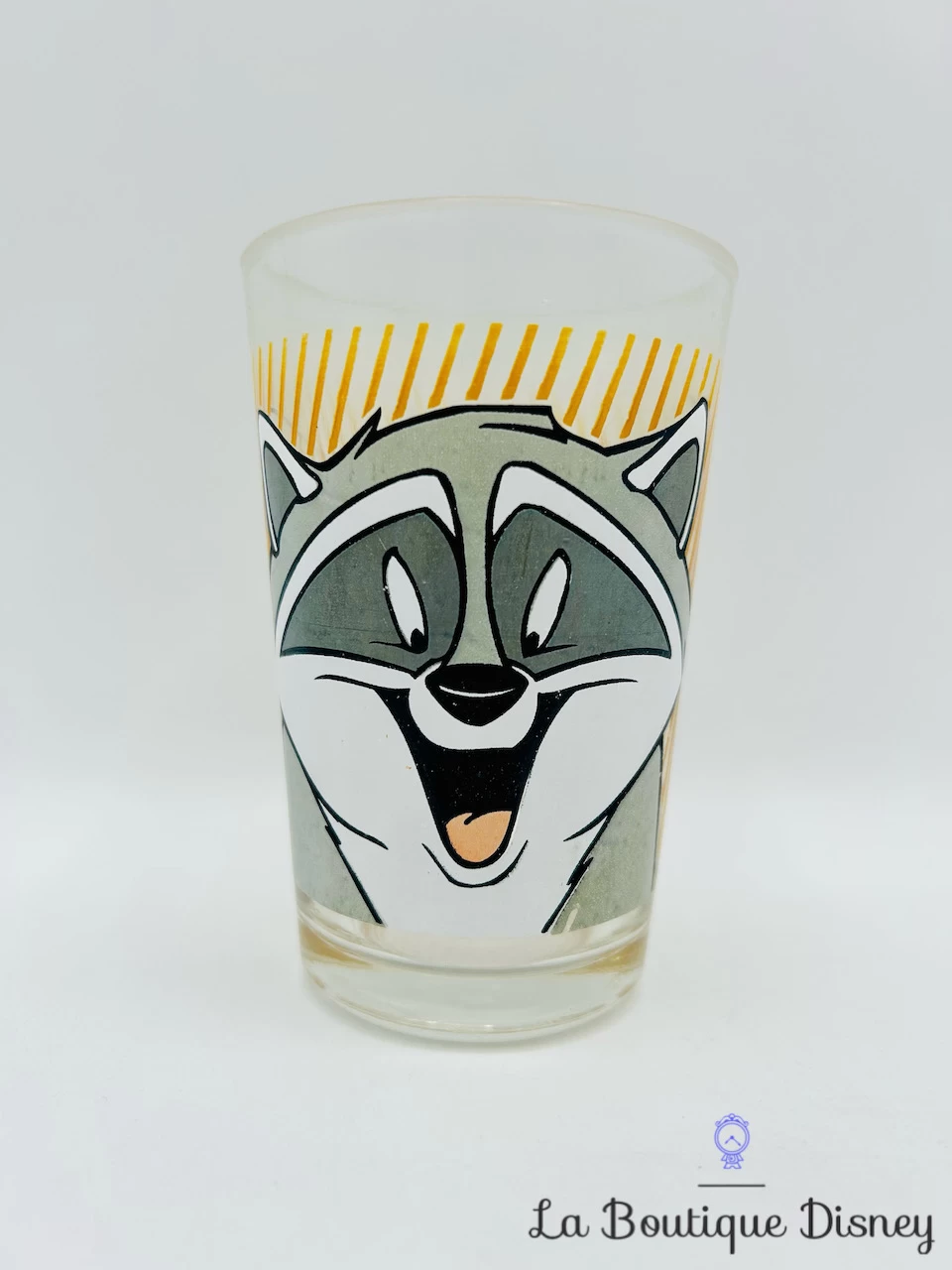 Verre à moutarde vintage représentant Meeko le raton laveur gris gourmand ami de Pocahontas. Il y a des rayures orange tout autour du verre.
